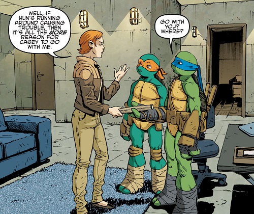 April évoquait son désir d’aider mieux les tortues avec Casey. Ce qu’ils n’avaient pu faire jusqu’ici. Il était temps pour eux de quitter un petit peu de la ville et de partir vers l’ouest, là où se trouveraient probablement les informations découvertes par Patrick Miller (TMNT #46). Hun était de retour, les tortues venaient de le voir plus tôt dans la soirée (FCBD 2015). Il avait quitté le Foot Clan et recommençait à boire. C’était le moment idéal de partir se changer les esprits avec un petit road trip !