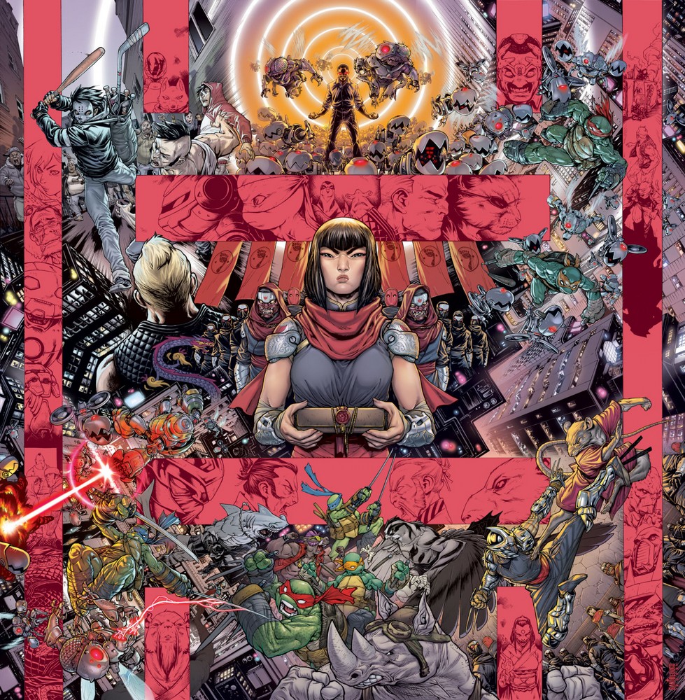 - Les couvertures principales dessinées par Mateus Santolouco des numéros de l’arc Vengence (TMNT #45 à #50) forment à elles six un diorama.