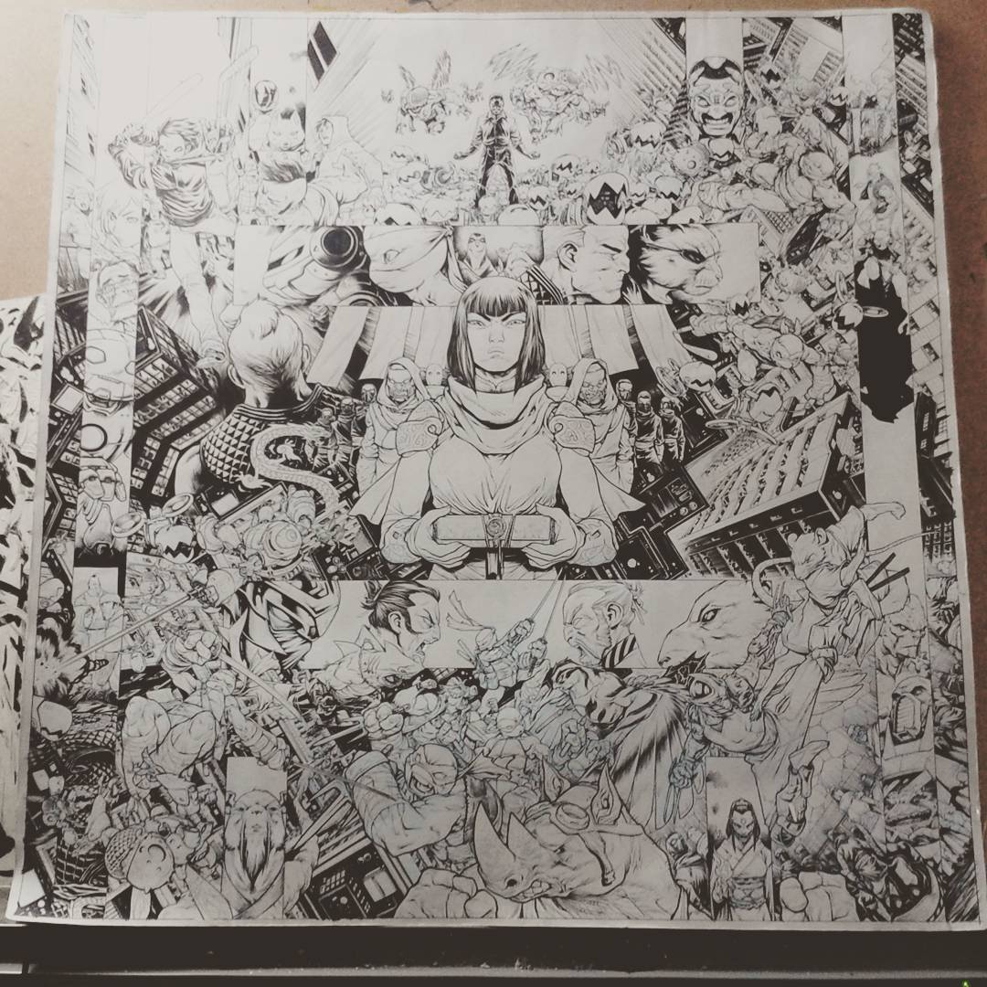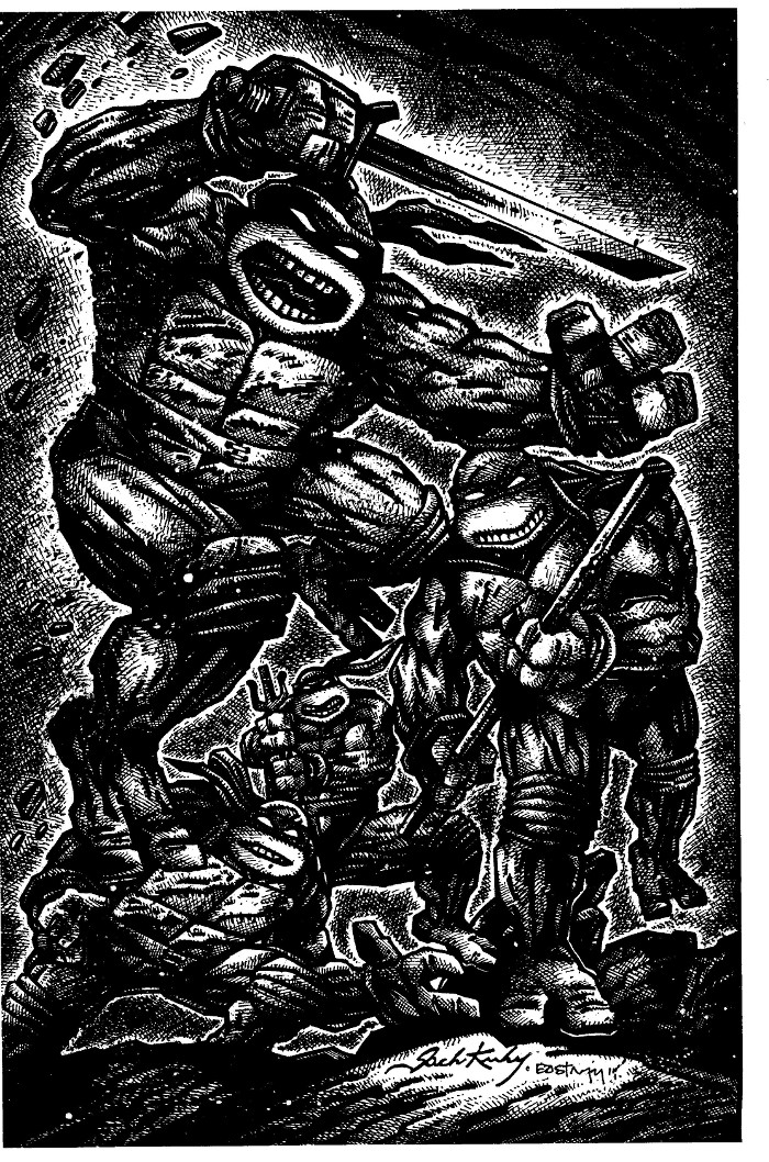 Voici l’image originale de Jack Kirby, dessinée pour Peter Laird et Kevin Eastman quelques années avant son décès. Pour l’une des couvertures de ce numéro, Eastman a décidé d’encrer une copie de ce dessin pour lui rendre hommage. Voici les deux originaux.