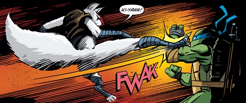 Avides de victoires, certains de l’issue du combat, ils acceptaient et sortaient déjà des couteaux de leur manteau. C’est alors qu’Alopex jeta vers son ami ses sabres, déchirant les manteaux et laissant les deux Street Phantoms vulnérables. Leonardo n’avait plus qu’à les frapper. Leurs compagnons préféraient battre en retraite, ramassant les deux guerriers vaincus et traversant les murs pour fuir. La tortue les laissait partir, ils devaient venir en aide à Splinter au plus vite. Le rat allait bien et venait à leur rencontre. Il était venu à bout de l’assassin Foot, dont la colère avait aveuglé ses capacités de combat. Pire encore, elle avait subi une véritable leçon, tant au combat que d’humilité. Splinter était bien meilleur en tous points et lui rappelait qu’elle lui devait le respect étant son maître avant de l’assommer.