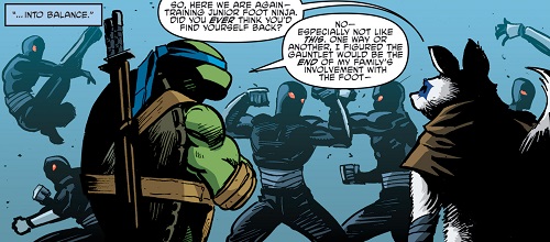 Devant une assemblée composée de ninjas Foot, Leonardo et Alopex se prêtaient à un petit entraînement. Chacun esquivait et attaquait son adversaire avec diverses techniques. Le combat terminé, ils se retournaient face aux hommes vêtus de noir pour leur laisser la main. Les deux mutants observaient les techniques utilisées par les ninjas tout en confessant leurs attentes et craintes depuis le changement au sein du clan. Leonardo pensait que la mort de Saki entraînerait la fin du Foot Clan. Si le clan était à présent entre de bonnes mains, tout n’allait pas comme Splinter l’aurait espéré, principalement depuis le départ de Michelangelo, qui l’avait beaucoup affecté même s’il cherchait à le cacher.