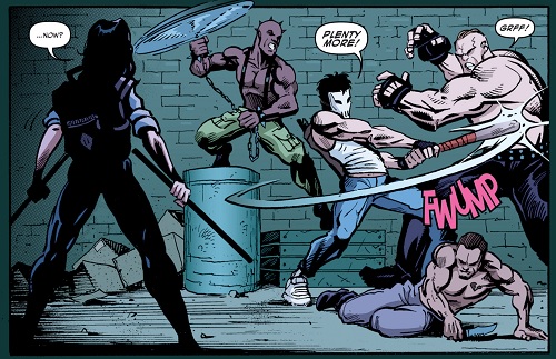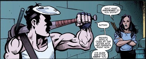 Beaucoup de choses avaient changées et Alopex n’avait plus revu Angel depuis longtemps. La jeune femme se promenait dans son quartier quand elle entendit des voix et des bruits de bagarre. Regardant vers une ruelle, elle voyait Casey régler leur compte à trois voyous. Partant l’aider, bâtons à la main, la bataille était déjà terminée. Calme et dubitative, la jeune femme cherchait à comprendre les motivations de Casey. Ces individus, aussi peu recommandables qu’ils puissent être, ne faisaient que marcher dans le quartier du justicier. Ce dernier s’étonnait de ne pas voir Angel avec son équipement. Celui-ci subissait quelques améliorations par Harold. En réalité, après tout ce qu’il s’était passé ces derniers temps à New York, elle voulait surtout un petit peu souffler. Ce n’était pas l’intention de Casey, qui lui proposait de passer voir April à la boutique. Lui, avait encore fort à faire, et voulait surtout se changer les idées après son retour du désert californien (Casey & April). Angel voyait bien que quelque chose ne tournait pas rond et sentait qu’il voulait surtout créer des problèmes là où il n’y en avait pas encore. Casey ne percevait plus les choses ainsi. Après leur rencontre avec le Pantheon, Il était décidé à prendre les devants et empêcher que de nouvelles menaces deviennent incontrôlables.