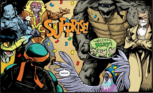 Michelangelo continuait de discuter avec son ami Mondo Gecko. S’il était hors de question de rejoindre le Foot Clan et ses frères, la tortue n’était pas sereine à l’idée de se rendre chez les Mighty Mutanimals et surtout Old Hob. Le gecko se voulait rassurant, son équipe n’était pas uniquement composée du chat mais de compagnons de divers bords. Convaincue, la tortue le suivi jusqu’à leur appartement. Là, une fête surprise l’attendait avec un gâteau. Tous les Mutanimals l’attendaient avec joie. Quelle meilleure entrée dans cette nouvelle famille ? Et ce, même sous le regard bienveillant d’Old Hob !
