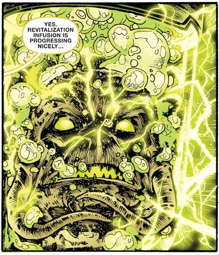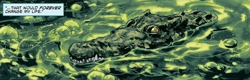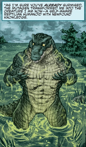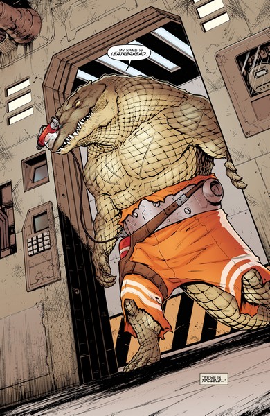 Mais le professeur n’avait pas fait venir les tortues que pour avoir leur accord à propos des utroms. Il les avait convoqués pour leur présenter un nouvel allié de poids, Leatherhead, celui qui l’avait aidé à sauver Donatello (TMNT (Vol. 5) #49 et TMNT (Vol. 5) #50). L’alligator mutant leur racontait son histoire. Les tortues préféraient ne pas lui dire que c’était certainement de leur faute si sa vie avait pris un tel tournant, plus de trois cent ans auparavant (Turtles in time #3). Après sa transformation, il aurait passé les siècles suivants à échapper aux autochtones et principalement aux armées de Krang, qui cherchaient à mettre la main dessus. Dernièrement, l’air étant devenu irrespirable, il avait besoin de trouver un échappatoire. Il n’était pas juste question de faire se rencontrer les cinq mutants ; Leatherhead voulait partir de cette île au plus vite et vivre dans une ville comme New York. Il avait aidé Donatello en fournissant le ooze nécessaire, il espérait donc une main tendue en retour. Les tortues acceptaient, n’ayant guère le choix. Mais allaient devoir garder un œil sur lui de crainte qu’Old Hob ne veuille s’emparer de lui pour ses Mighty Mutanimals. Ou même Splinter pour son nouveau clan…