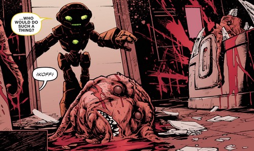 Trois heures après le début de la procédure, le professeur Honeycutt réalisait une ronde afin de sonder les signes vitaux des convalescents pour s’assurer que tout allait pour le mieux. Mais ouvrant une autre salle de réveil, le professeur Honeycutt découvrit avec horreur un véritable massacre ; des utroms gisaient dans une flaque de sang, au sol comme dans les compartiments brisés. Les utroms étaient en charpie. Quelque chose arrivait derrière le robot et le décapitait. Le Fugitoid reconnaissait son agresseur…