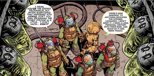 Les tortues retrouvaient le professeur Honeycutt à Burnow Island. Le scientifique leur montrait une salle où des utroms avaient été gardés en stase dans des bocaux par le général Krang. Les tortues se montraient méfiantes à leur égard ; qu’est-ce qui leur disait qu’un autre Krang ne dormait pas, encore impuissant, parmi tous ces civils assoupis ? D’après le Fugitoid, le risque existait. Mais il fallait prendre une décision très rapidement. Après le combat contre le Krang (TMNT #44), les générateurs avaient été gravement endommagés et le local de stase risquait bientôt de connaître d’importants dysfonctionnements. Si l’atmosphère de Burnow Island n’était plus respirable pour les humains, due à la terraformation du Technodrome, elle l’était pour les utroms. Si rien n’était fait rapidement, ils allaient mourir dans leur sommeil. Et Honeycutt refusait, éthiquement parlant, de garder des prisonniers innocents. Le professeur voulait absolument les sortir de là. Les tortues n’avaient d’autre choix que d’aller dans son sens.