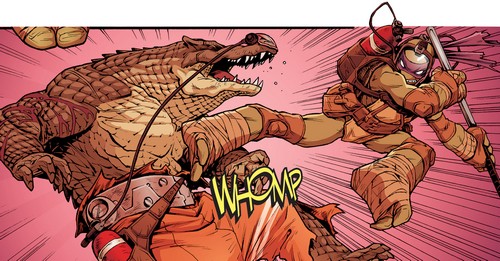 Michelangelo usait son grappin pour subtiliser le masque à oxygène de l’alligator, qui ne tardait pas à en faire de même avec son adversaire à carapace. Le tenant fermement de sa queue, il se servait de la tortue comme garantie de départ. Donatello priait ses frères de le laisser partir pour New York, comme ils lui avaient promis. Après tout, Leatherhead lui avait sauvé la vie (TMNT #49) et il ne voulait pas perdre Michelangelo. Il veillerait personnellement à ce que le portail se referme derrière eux, il rentrait avec l’aide d’Harold plus tard.