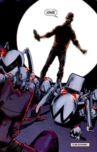 Stockman emmenait Old Hob dans l’une des pièces de son laboratoire. Derrière une porte blindée se cachait l’armée que le chat demandait. Il s’agissait de robots servant à la détection et la destruction des engins explosifs improvisés. Avec l’aide de ses techniciens, Baxter avait recalibré les fonctions de ses robots pour la mission de Hob. Surpris, le chat s’avançait dans la pièce que Baxter refermait derrière lui. Le félin mutant se retrouvait livré à cette armée de ferraille. Il s’agissait pour Stockman à la fois de tester ses machines et d’avertir Old Hob qu’il n’aurait pas d’autres chances.