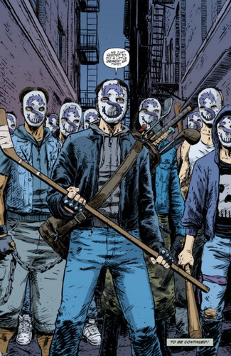 Alors que les tortues, Splinter et Nobody faisaient face aux hommes de main de Darius Dun, Leonardo attendait le feu vert de leur père pour demander le renfort des ninjas Foot. Ils en avaient grandement besoin, leurs adversaires gagnaient du terrain. Mais le rat attendait un autre type de renfort : Casey Jones arrivait avec les Purple Dragons. Tous portaient un masque de hockey orné d’un dragon mauve.