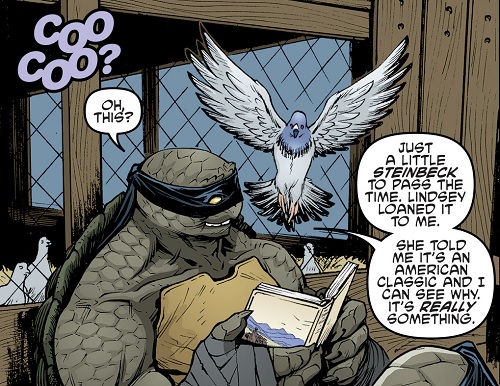 • Lorsque Casey, April et les tortues arrivaient dans la maison de campagne des O’Neil dans le film de 1990, le justicier masqué demandait en voyant la veille maison si ce n’était pas là qu’avait été tourné Les raisins de la colère, adaptation cinématographique du livre que Slash lit au début de ce numéro, écrit par John Steinbeck en 1939.