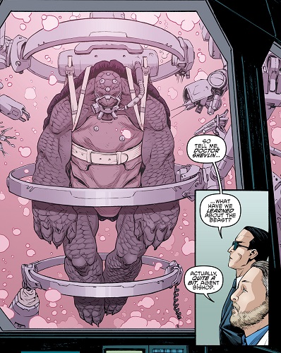 tmnt-67-idw-comic-4-slash-bishop-tortues-ninja-turtlesSlash avait été placé dans un tube de stase dans les laboratoires de l’Earth Protection Force, sous le regard du docteur T. J. Shelvin. Bishop admirait leur prise tout en demandant déjà les premiers résultats de l’équipe scientifique. Les analyses sanguines avaient démontrées que la tortue alligator avait un produit étranger dans son sang, le sérum psychotrope, à l’origine de son intelligence poussée. Les différents scanners passés sur son cerveau avaient quant à eux mis en évidence les traces d’un traumatisme. Le colonel Knight, qui arrivait à ce moment, évoquait les traumatismes post-traumatiques. Shelvin penchait plutôt à de la torture ou un entraînement spécifique. Pour l’heure, Slash était éveillé mais contrôlé mentalement par impulsions électriques grâce à des capteurs implantés dans son crâne. En d’autres termes, ils pouvaient en faire ce qu’ils voulaient avec encore quelques réglages. Bishop était plus que satisfait de ce qui se préparait.