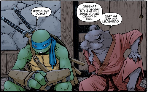 tmnt-67-idw-comic-5-leonardo-splinter-tortues-ninja-turtlesLeonardo s’était rendu dans les jardins du quartier général du Foot Clan pour trouver une oreille amie. Splinter avait été prévenu et se venait à sa rencontre, escorté par Jennika. Le rat remerciait sa chunin avant de s’assoir à côté de son fils qui semblait désemparé. Racontant ses problèmes avec ses frères, Splinter ne pouvait s’empêcher d’esquisser un sourire. Le rongeur constatait que son fils rencontrait les mêmes problèmes qu’il avait endurés quand il était à la charge des quatre tortues. Il devait continuer à agir comme il l’avait toujours fait pour garder le contrôle des siens. Ses frères également souffraient de leurs nouvelles conditions, sans un père à la tête du groupe. C’était à Leonardo de s’en charger. Splinter ne doutait pas des compétences de son fils, qui serait un jour un très grand maître.