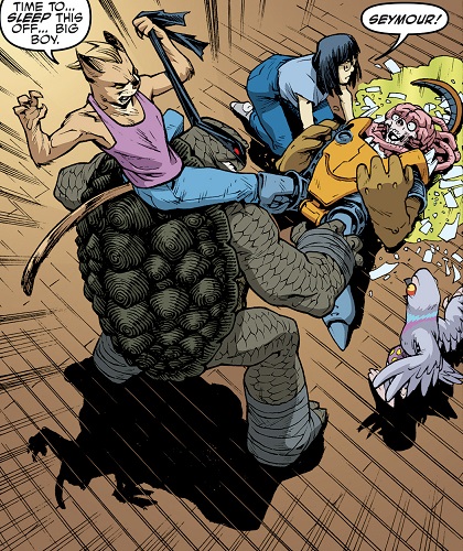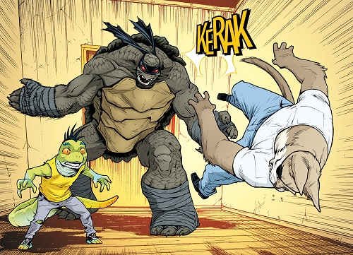 Le soir venu, les Mighty Mutanimals étaient réunis dans le salon de leur habitat devant la télévision. Même Old Hob était présent. Certains avaient une bière à la main, d’autres savourant du popcorn ou des chips. Quelque chose frappait aux carreaux de l’appartement ; il s’agissait de Jimmy, totalement affolé. Alors que Pigeon Pete essayait de comprendre ce que son cousin cherchait à lui dire, Mondo Gecko allait ouvrir la porte. Quelqu’un avait frappé. Quelle ne fut pas leur surprise voyant qu’il s’agissait de Slash ?tmnt-67-idw-comic-6-mondo-gecko-slash-old-hob-tortues-ninja-turtles Hob sortait de sa petite déprime habituelle pour lui souhaiter la bienvenue. Voilà des semaines qu’ils ne voyaient plus leur ami à carapace (TMNT (Vol. 5) #54). Le chat fut immédiatement balayé du revers de la main du colosse. Le regard de Slash était comme perdu, ses yeux rougeoyants. Sans perdre de temps, le mutant zombifié s’emparait Gecko par la queue et le lançait contre un mur. Sa queue se détachait de son corps.