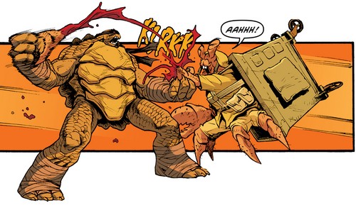 Slash tmnt-67-idw-comic-1-slash-jimmy-tortues-ninja-turtleslisait Les raisins de la colère sur les toits, accompagné de Jimmy, le cousin de Pigeon Pete. Plongée dans sa lecture, la tortue ne prêtait pas attention aux bruits extérieurs. Soudain, le sol s’effondra. Tout le bâtiment, abandonné, croulait avec fracas dans un amas de poussières et de gravats. Les forces de Dark Water étaient déployées sous le commandement du sergent Alex Winter. La tortue alligator sortait des décombres prête à en découdre ; ses agresseurs faisaient feu en retour. Slash recevait de nombreuses fléchettes paralysantes et s’effondrait au sol. Bishop faisait irruption sur le champ de bataille, fière de sa prise. Le mutant allait être acheminé jusqu’aux laboratoires de l’Earth Protection Force. Depuis sa cuisante défaite aux laboratoires du T.C.R.I. (The war to come), il n’était plus question de mesurer les moyens conte les mutants. Il ramassait le livre que lisait Slash avant de le jeter au sol pendant que la tortue était placée dans un container à l’aide d’une grue. Jimmy partait avertir son cousin.