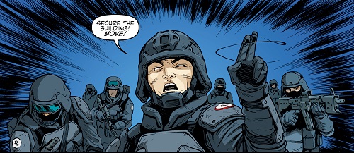 Le sergent Alex Winter et ses hommes pénétraient à leur tour dans le bâtiment. Slash était redevenu inoffensif, contrôlé par Bishop à distance. Les soldats comptaient sept victimes inconscientes, certaines baignant dans leur sang, d’autres juste sonnées. Il manquait quelqu’un. Hob avait pris la fuite. Tétanisé, le chat observait le massacre de ses amis depuis les toits dans bâtiments voisins.tmnt-67-idw-comic-9-alex-winter-dark-water-tortues-ninja-turtles