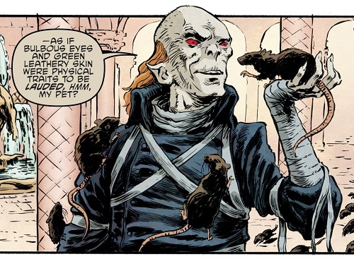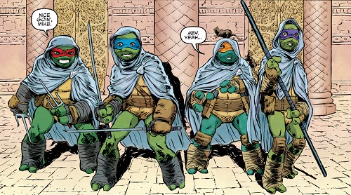 Mais alors que tous discutaient sur l’utilité ou la faisabilité de ce plan, le Rat King entendit des chuchotements. Quelqu’un se plaignait « d’en avoir un sur la tête ». Quelques-uns de ses rats lévitaient devant lui. D’un geste de la main, il faisait apparaître ce qui semblait invisible sous les yeux de tous. Les quatre Tortues Ninja espionnaient la rencontre du Pantheon, cachées sous les capes d’Harold Lillja.