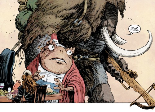 Bob, l’une des grenouilles servantes venait de tomber dans les pommes à la vue de cet être qui venait de jeter un froid dès son arrivée. Le baron s’empressait de le faire s’assoir avec ses frères et sœurs avant de commencer un petit discours de bienvenue, ne manquant presque plus personne. C’est alors qu’un rat grimpa sur sa tête. À peine le crapaud avait-il eu le temps de soupirer d’agacement qu’il sentit un petit courant d’air et le poids quitter son crâne. Le rat venait de se figer dans le mur derrière lui, empalé par un fin carreau d’arbalète. Derrière lui, un imposant personnage caché par sa fourrure saluait les siens avant d’arracher le rat au mur et le croquer. Il s’agissait du dernier membre attendu, Manmoth (ManmouthVF).