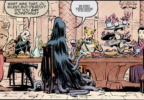 Une voix vint le réconforter. Venant depuis les airs, Aka arrivait elle aussi pour le festin. Le crapaud était heureux de voir arriver cette sœur. Enfin une personne sage avec qui il s’entendait à merveille ! Hélas, Kitsune ouvrit à son tour la porte et conseillait immédiatement l’organisateur de se méfier de sa sœur ailée. La sorcière avait encore en travers de la gorge son petit jeu avec April (Casey & April #4) qui en avait résulté par la perte de son combat (TMNT (Vol. 5) #60) et d’Alopex par la suite (TMNT (Vol. 5) #66).