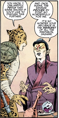 La femme ne cachait pas que leur dernière entrevue n’avait pas été des plus cordiales. Il l’accusait de ne pas continuer à suivre les règles du Pantheon et prétendait qu’il était parti aussi vite qu’il était arrivé ce soir-là. Bien entendu, elle ne mentionnait en aucun cas son rendez-vous avec Tetsu-Oni, ni le fait que son frère ait été jeté dans son portail (TMNT / Ghostbusters #1). Jagwar renchérissait sur les sujets qui fâchaient Kitsune en lui demandant plus d’informations sur les fameux mutants qui l’agitaient tant ces dernières années.