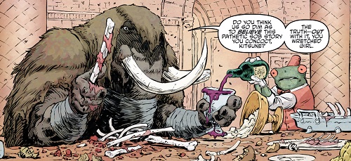 Les préparatifs pour la réception du Pantheon battaient leur plein. Le Toad baron (baron CrapaudVF) était cependant dans tous ses états. Stressé par la venue de ses frères et sœurs, il voulait donner la plus belle réception jamais organisée. Soudain il poussa un énorme cri, et appela Alberto, une de ses grenouilles laquais. Sur son vêtement, se trouvait un poil blanc. Indubitablement un poil d’Alopex ! Il haïssait profondément cette renarde et son amie Angel qui avaient semées la zizanie quelques jours plus tôt dans son palais (TMNT Universe #10). Se rendant compte qu’il allait trop loin, il s’empressait de s’excuser auprès de son valet avant de lui demander où en étaient les préparatifs. Tout était pratiquement terminé.