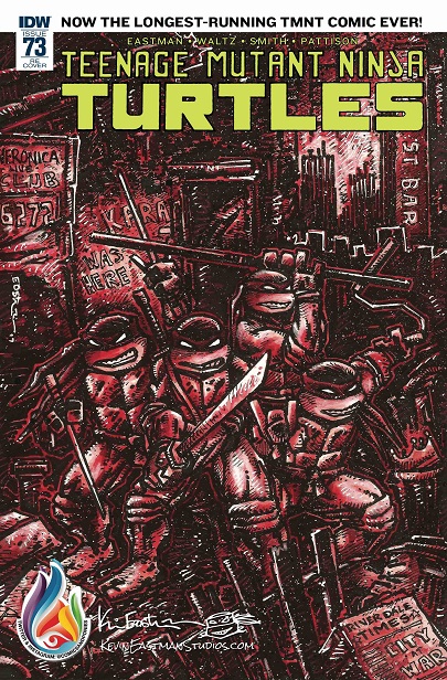 • Le 14 avril 2017, Rich, du site de référence tmnt-ninjaturtles.com a proposé une campagne Kickstarter afin de financer une couverture exclusive de ce numéro pour les contributeurs. Elle serait dessinée par un grand nom de l’ère Mirage Publishing afin de célébrer le plus long ongoing des comics Tortues Ninja (attention on parle bien d’ongoing et non de numéros sortis chez un même éditeur !). En effet, le record était jusqu’alors détenu par TMNT Adventures et ses 72 numéros, publiés chez Archie Comics entre 1988 et 1995. Le projet fut embrassé par les fans et la somme minimale requise (2073 $) fut atteinte en moins de 24 heures. D’autres paliers furent alors annoncés et le nom de Jim Lawson révélé le 22 avril.