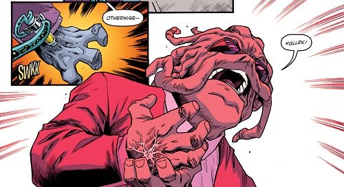 Dask interrompait l’état des lieux du roi pour présenter à l’assemblée le conseiller Apap, en charge du dossier de Krang. Les nouvelles n’avaient rien de rassurantes pour le procès. Avec la destruction d’Utrominon, les mieux placés pour témoigner contre le général étaient tous morts et les preuves disparues. Toutefois, il restait des témoins éparpillés dans la galaxie. Le spécialiste montrait les portraits de cinq individus qui avaient de quoi enfoncer la défense de l’utrom au cours de son procès. Hélas, ils préféraient certainement rester discrets et n’accepteraient pas forcément de témoigner promptement, craignant des représailles du général, encore très influent. Pire encore, certains pouvaient espérer voir Krang libéré ! C’était la raison pour laquelle ils envoyaient le professeur Honeycutt essayer de les convaincre. Le conseiller Apap n’avait pas vu un tentacule tenant une seringue sortir de sous la table alors qu’il présentait son dossier. Piqué à la main, Apap tombait inerte au sol. Michelangelo apercevait le tentacule et Raphael se jetait dessus. Dask lui venait en aide, tout en assurant la sécurité de la famille royale. Il appelait Zak et Kala en renfort dans la salle. La chose qui avait attaqué le conseiller se cachait sous la table, que Leatherhead démolissait d’un coup de patte. Il s’agissait d’Hakk-R, soulevé par un tentacule. La créature biocybernétique crachait du bout de l’un de ses bras encore libre une sorte de matière visqueuse aux yeux de l’alligator qui lâchait prise.