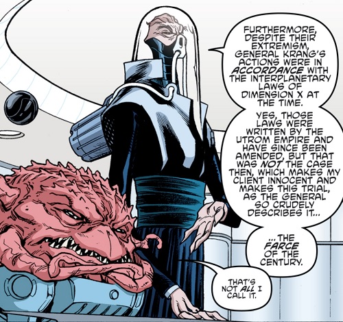 Le professeur Honeycutt prenait la parole en premier pour présenter les éléments du dossier sur lequel il travaillait depuis la mort d’Apap (TMNT (Vol. 5) #73). Il était inutile de rappeler que les méfaits de Krang étaient connus dans toute la galaxie. Donatello et lui étaient confiants quant à l’issue du procès. Pour témoigner des crimes de guerre pour lesquels l’utrom était accusé, il allait appeler un à un chaque individu que les tortues étaient parties chercher récemment (TMNT : Dimension X). Lorsque Vin-Bini put prendre la parole, il commença par reconnaître qu’il était impossible d’ignorer les agissements plus que questionnables de Krang, mais que l’utrom avait fait ça uniquement dans le but de sauver son peuple d’Utrominon, mourante (TMNT : Utrom Empire). De plus, les crimes qui lui étaient reprochés avaient été réalisés à une époque où la législation de l’Empire Utrom était encore en vigueur. Si certains le traitaient de criminel, Vin-Bini estimait que Krang pouvait aussi être considéré comme un héros par son peuple.
