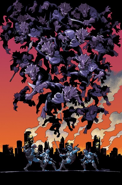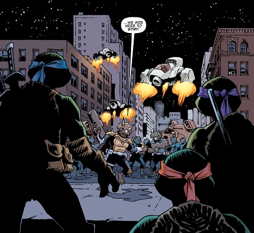 Sortant des souterrains, les mutants voyaient les rues envahies de vaisseaux. Des triceratons déferlaient également depuis des portails de téléportation. L’invasion commençait…