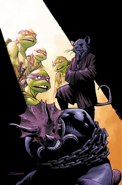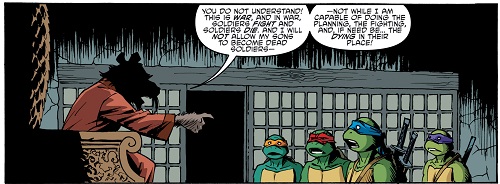 Les tortues avaient vues la vidéo, qui comptait déjà plus de 16 000 vues en deux heures. Leonardo appelait ses frères, Splinter était prêt à les recevoir. Dans la salle principale, le rat attendait ses fils, prêts à les aider. Raphael ne semblait pas heureux de retrouver son père depuis la dernière fois (TMNT #64). L’aîné prit la parole en défense des triceratons. Ils savaient ce qu’il s’était passé et connaissaient bien leurs amis à corne. Il s’agissait d’un malentendu et ils voulaient convaincre le Foot Clan de cesser la guerre contre eux. Splinter était surpris de ces nouvelles, encore plus de leur amitié avec Zom, mais n’allait pas cesser le combat. Ils devaient arrêter ces redoutables ennemis avant qu’ils ne prennent la Terre. Les arguments de ses fils ne suffisaient pas. Ils étaient en guerre.