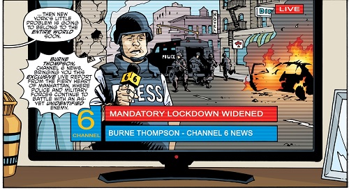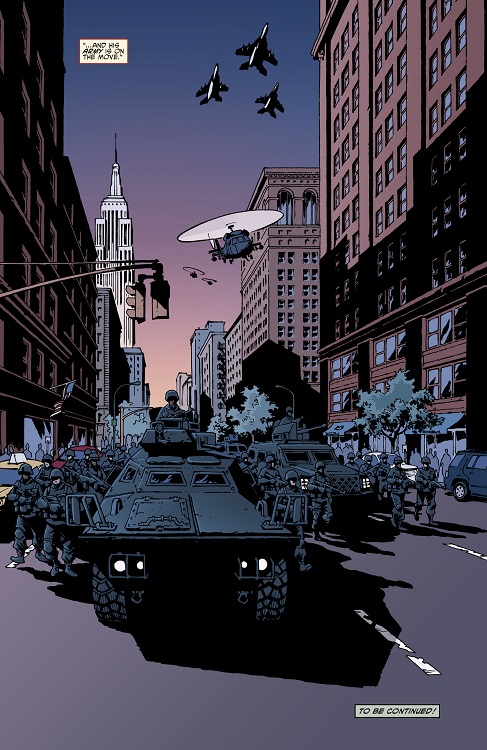 se trouvait dans le bureau du sénateur Robert J. Lawson, du Michigan, pour répondre du désordre que l’EPF avait provoqué dans les rues de New York ces dernières heures. L’agent venait surtout lui demander des renforts. La télévision s’était emparée des évènements, principalement Channel 6 News. Burne Thompson couvrait l’actualité depuis la seconde vague d’attaque, débutée il y avait bientôt 24 heures (TMNT #77). Si la première attaque pouvait laisser penser à un acte terroriste isolé (TMNT #76), la seconde salve était bien plus grave. Presque tous les ponts de la ville avaient été abattus, à l’exception du Brooklyn Bridge. Des vidéos amatrices montrant la police et les civils sous le feu ennemi amenaient à se poser de nombreuses questions. Aucun militaire n’était à même d’identifier le type d’avion qui attaquait la ville. Les agresseurs semblaient porter des armures sophistiquées et des armes encore inconnues. Les rumeurs d’une attaque extraterrestre se répandaient dans les rues, mais le détective Kara Lewis tenait à être clair. Personne ne savait encore sous le feu de quel ennemi ils étaient, terroriste, mafia, gangs de rue, ou extraterrestres.