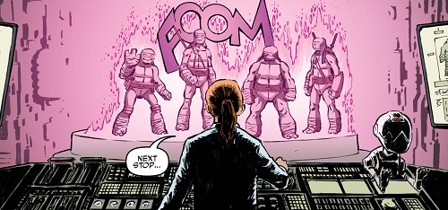 Dans les salles du T.C.R.I., les tortues étaient sur le point d’être téléportées. Elles voulaient trouver des informations sur la manière de vaincre Rat King, et cela commencerait par une petite visite au Toad Baron. Même si tout ne s’était pas bien passé la fois précédente (TMNT #72) c’était sans doute la seule manière de trouver des réponses.