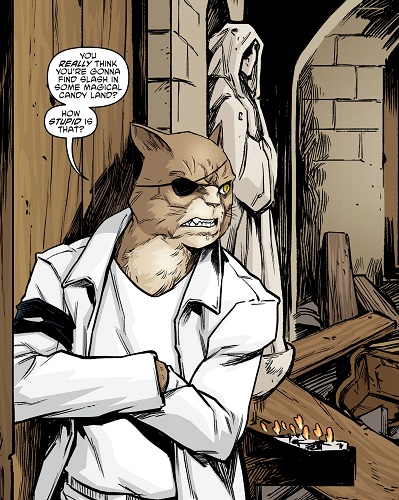 Splinter se fit interrompre dans sa méditation dans la salle du trône. L’un des orphelins lui demandait de l’aider, car ils souhaitaient avec ses amis regarder un autre film, mais ils ne comprenaient pas bien la technologie à laquelle ils avaient à faire. Le rat alla les aider sur le ton de la bienveillance. Il s’agissait des vieilles VHS de la collection de Michelangelo. Lançant le film The octagon, les enfants se demandaient qui pouvait bien être Chuck Norris. Cela rappelait les conversations de ses fils face aux films de combats, débattant de qui était le meilleur artiste martial du cinéma, entre Bruce Lee, Norris, Jackie Chan et Jean Claude van Damme. La bonne époque, quand la famille était soudée. Une voix tira le rat de son souvenir. Karai venait de faire irruption, accompagnée d’Ocho, Bludgeon et Koya. Elle venait revendiquer le trône du clan…