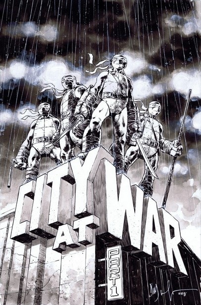 - City at war est un arc en huit numéros. Pour célébrer les huit ans de publication du comic des Tortues Ninja, IDW Publishing a décidé pour ses covers RI de rendre hommage à ses dessinateurs fars et les grandes lignes de chaque années. Ainsi, cette couverture, dessinée par Dan Duncan, qui avait couvert l’ongoing entre les TMNT #1 et TMNT #12, représente les grands évènements de Change is constant.