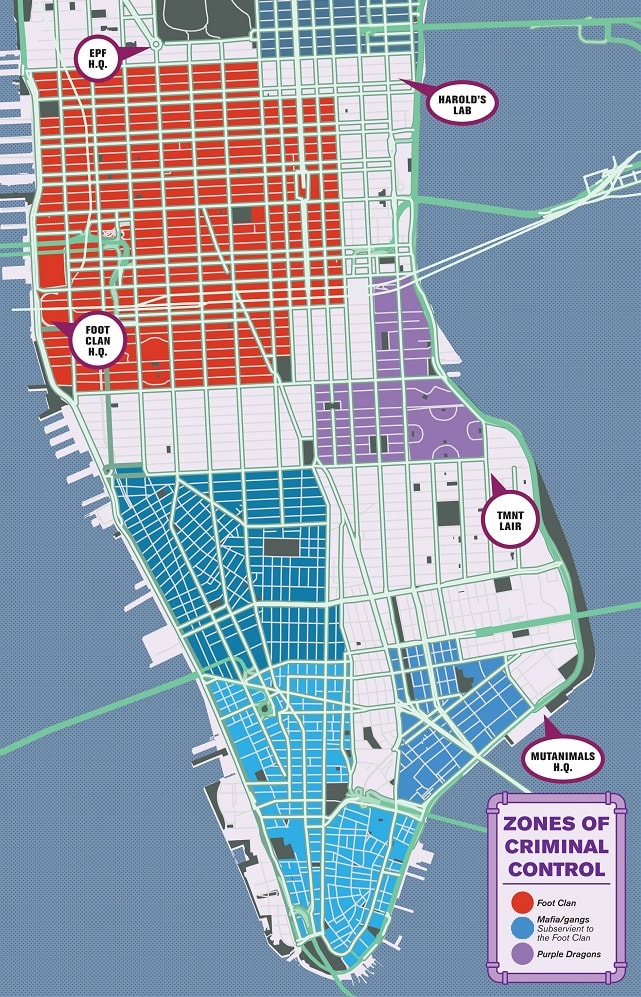 À la fin de ce numéro, une carte de Manhattan est présentée pour expliquer les possessions des différents groupes de la ville au centre de l’intrigue. Toutefois, des quartiers sont indiqués en bleus, mais pas reportés dans la légende. De même, cette dernière indique qu’en jaune, devraient figurer être les possessions des mafias.