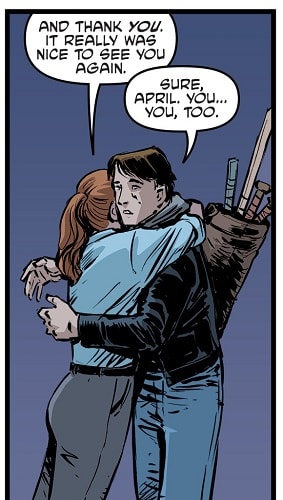 April faisait valoir le programme électoral du candidat Baxter Stockman dans ses quartiers. Dans le public, elle vit un visage familier, celui de Casey Jones. Le jeune homme venait voir si tout allait bien pour son amie. Se dirigeant vers l’arrière du bâtiment pour discuter, il lui expliquant la situation critique dans laquelle ils se trouvaient. Donatello avait déjà prévenu April, et Stockman avait élevé la sécurité des lieux avec des Flyborgs. Finalement tout allait pour le mieux ici. La jeune femme prit son ami dans ses bras et lui dit au revoir.