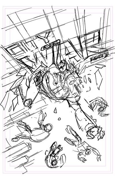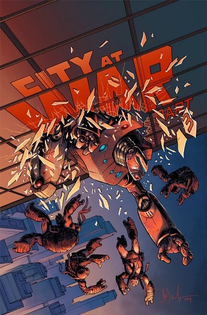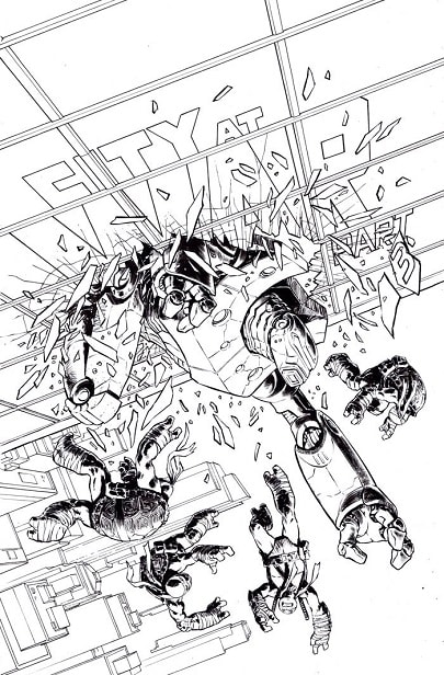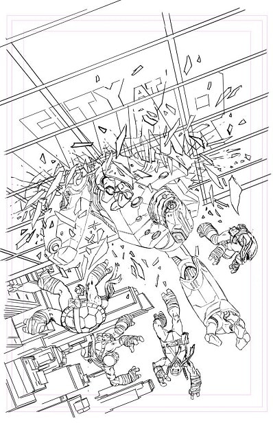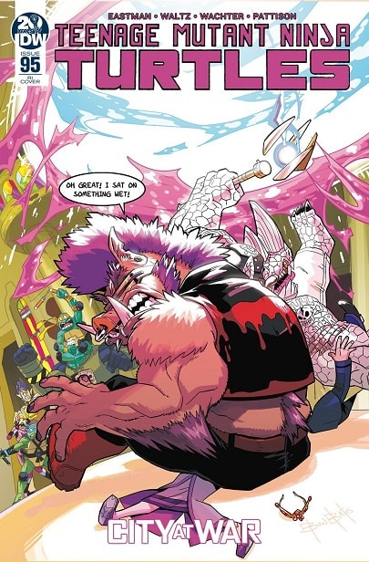 - City at war est un arc en huit numéros. Pour célébrer les huit ans de publication du comic des Tortues Ninja, IDW Publishing a décidé pour ses covers RI de rendre hommage à ses dessinateurs fars et les grandes lignes de chaque années. Ainsi, cette couverture est dessinée par Ben Bates, qui avait couvert l’ongoing entre les TMNT #17 et TMNT #20 et qui vient ici rendre hommage à sa mini-série emblématique Bebop & Rocksteady destroy everything.