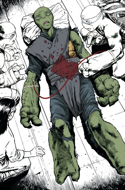 La fourgonnette des tortues était apparue dans les égouts. Plus précisément devant l’entrée, en ruine, de leur ancien repaire. C’était le seul endroit auquel Donatello avait pensé en si peu de temps et dont il connaissait les coordonnées. Le plan C devait être réalisé au plus vite, Metalhead les connaissait aussi. Ils avaient peu de temps devant eux. Après cela, ils partiraient vers un autre lieu, cette fois inconnu de la tortue, pour s’assurer que le robot ne les repère pas. Angel leur proposa la maison de son père. Sans tarder, Leonardo élaborait un plan. Casey irait chercher ses Purple dragons, qui ne devaient pas être loin du Skara Brae. Alopex et Angel s’assureraient que la maison de Brooklyn Bridge ne présentait aucun danger. Enfin, Michelangelo et lui rassembleraient les derniers ninjas Foot. Donatello saisit le bras de son frère. Il avait besoin de lui ici en réalité. Après que leurs amis soient partis, la tortue demanda à Leonardo son bras. Il voulait user le sérum présent dans son sang pour essayer de sauver Jennika, remplaçant le ooze perdu. Surpris, il comprit très vite qu’ils n’avaient guère d’autre choix. Retirant les bandes de son bras, il inséra une aiguille, prêt pour la transfusion.