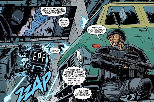 Soudain, l’alarme du laboratoire retentit. Le plafond s’écrasa sur les amis, laissant apparaître Metalhead. Au-dessus du bâtiment, un hélicoptère surveillait l’opération. À son bord, John Bishop ordonnait à ses hommes de cercler l’entrepôt et de l’assaillir. Les autres tortues, Casey, Angel et Alopex se trouvaient dans une autre pièce du bâtiment, et furent soufflés à leur tour par une explosion. Bientôt, des soldats de l’Earth Protection Force pénétraient dans les couloirs, armes à la main. Les mutants s’apprêtaient à défendre les lieux coute que coute, pourvu que cela laisse du temps à leurs amis pour sauver Jennika.