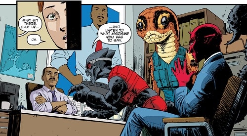 - Initialement, ce numéro devait sortir le 19 juin. Repoussé au 3 juillet, l’ongoing n’a pas eu de publication pour le mois de juin 2019. On peut imputer ce retard à la volonté de faire coïncider cet évènement à la San Diego Comic Con, deux semaines plus tard. Le sujet étant encore très vif, il fut très largement débattu lors du salon.