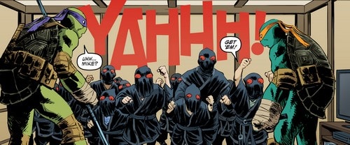 Karai marchait sur les pas d’Oroku Saki, réunissant à son tour une assemblée de la pègre de New York, dans le même théâtre que son ancêtre (TMNT #27). Son discours serait sobre, sa proposition, plus qu’alléchante. Il n’était plus question de contrôler les mafieux de la ville par la terreur, mais plutôt de s’en faire des alliés précieux. Ils n’appartiendraient plus au Foot Clan, ils seraient libres à présent de faire de leur argent ce que bon leur semblait. Le clan ne ferait que les surveiller dans leurs agissements, comme une sorte d’arbitre de New York. Arrivaient sur scène bientôt Bebop et Rocksteady, qui fustigeaient leur retour. Karai avait l’intention de montrer que son clan était bien de retour, plus fort que jamais.