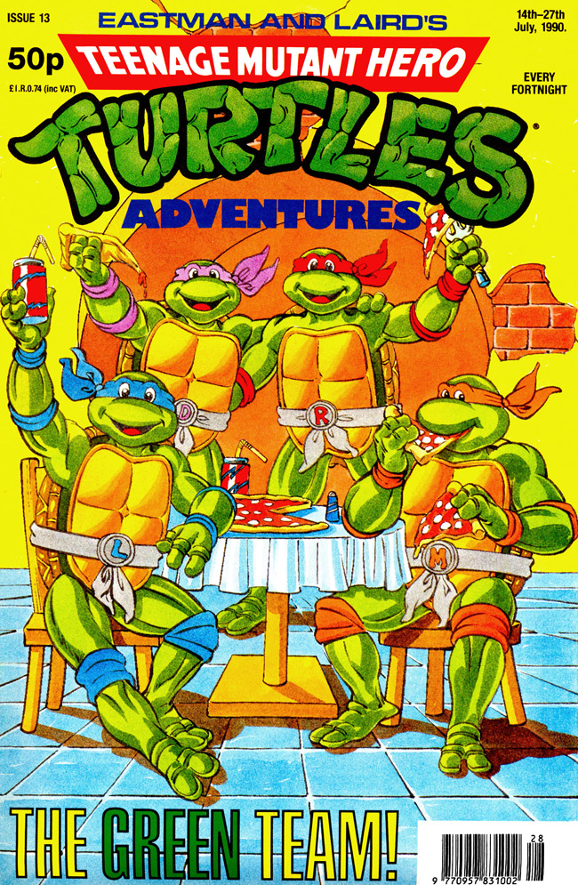 - Couverture magazine « Teenage Mutant Hero Turtles #13 », Fleetway (Grande-Bretagne, 1990) – Dessinateur inconnu. Édition britannique sortie entre le 14 – 27 juillet 1990.