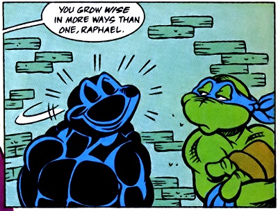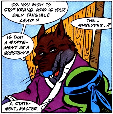 Après toutes les aventures des tortues, Leonardo avait besoin de conseils. Il était parti s’entretenir avec son maître, qui regardait la télévision. Il lui racontait dans un premier temps leurs péripéties depuis la rencontre avec Leatherhead (TMNT A. #6), jusqu’à leur confrontation avec Wingnut et Screwloose (TMNT A. #8). Tout ce qu’ils avaient vécus, et surtout appris sur Krang et son goût pour le meurtre et la domination l’inquiétait au plus haut point. Tout comme les mots de Mary Bones. De fil en aiguille, la tortue comprenait par les questions du vieux rat que leur solution était de trouver le repère de Shredder. Lui seul était la clé pour avancer. Les tortues s’en allaient trouver des pistes. Raphael commençait à s’attacher à sa tenue de catch noire (TMNT A. #7) et comptait la garder pour soi-disant mieux se dissimuler dans l’ombre.