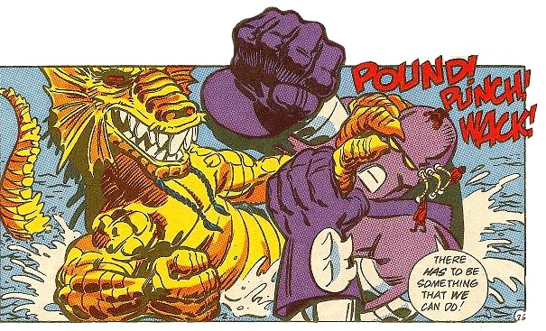 Le dragon faisait son retour, et jetait son ennemi au sol. Les tortues étaient quelque peu secouées. Le combat se poursuivait sur les docks puis dans l’océan. Aucun n’avait réellement le dessus sur l’autre. Les tortues s’accrochaient à la tête du géant comme elles pouvaient, mais au moment de tomber, le dragon les vit et les saisit avant d’infligeant son dernier coup au robot, qu’il envoyait valser.