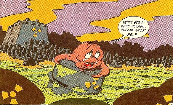 Quelque part sur la planète Morbus, Krang luttait pour sa survie. Il flottait sur un tonneau au milieu d’un lac de déchets toxiques. Il sentait que son heure était proche et se lamentait d’avoir perdu le combat contre Cherubae (TMNT A. #13). La sorcière avait été plus forte, mais l’issue du combat aurait été toute autre s’il avait eu la Turnstone entre ses tentacules.