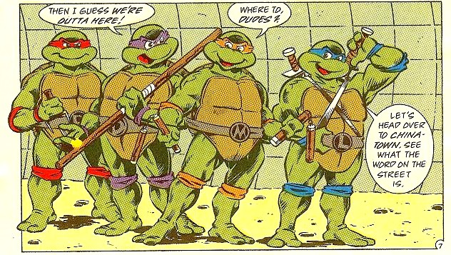 Les tortues partaient pour Chinatown à la recherche d’indices. Sur le chemin, ils se demandaient pourquoi leur maître tenait tant à faire de Shredder sa priorité. C’est alors que les mutants surprirent des individus qui semblaient préparer un mauvais coup depuis les égouts. Les hommes s’apprêtaient à passer à l’action, munis d’un bazooka. C’en était assez, les tortues fondaient sur le groupe pour le mettre hors d’état de nuire. Hélas, l’arme à feu avait eu le temps de tirer.