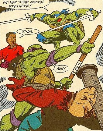 Reprenant leurs esprits dans les décombres, les tortues finirent le travail, ligotant les malfaiteurs et prenant leurs armes. Il ne leur restait plus qu’à appeler la police, manger des pizzas, et continuer leur enquête sur Shredder.