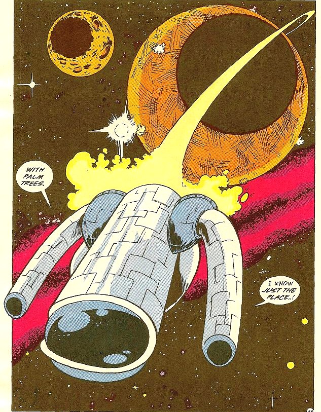 À l’intérieur, le ménage avait très rapidement été fait. Bellybomb était pressé de quitter la planète. Krang était déjà aux commandes du vaisseau. Sa réputation l’avait précédé, il n’avait qu’à donner son nom au fugitif pour qu’il comprenne à qui il avait affaire. Le vaisseau se lançait dans les airs, en direction d’une planète où ils pourraient semer le chaos et trouver des palmiers. Krang savait parfaitement où les amener…