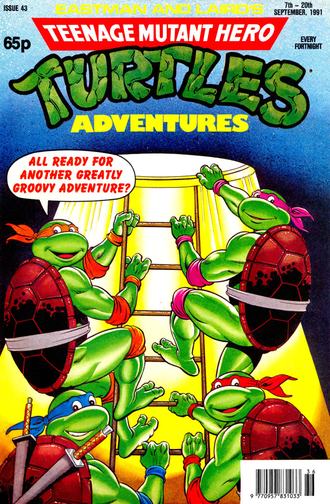 - Couverture magazine « Teenage Mutant Hero Turtles #43 », Fleetway (Grande-Bretagne, 1991) – Dessinateur inconnu. Édition britannique sortie entre le 7 – 20 septembre 1991.