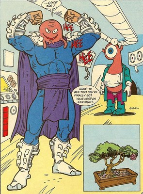 Krang, accompagné de Bellybomb et de Slash, descendaient pour observer le lieu. À la surprise de la petite créature rosâtre, ils étaient face à Bebop et Rocksteady ! Les deux mutants débiles n’avaient pour unique vêtement qu’une feuille de vigne entre les jambes. Il s’agissait de la planète sauvage où Cherubae les avait envoyés après leur défaite sur Hirobyl (TMNT A. #13).