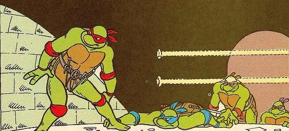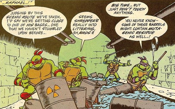 pestait face à l’échec de ses derniers plans. Le robot Foot géant lui avait permis de débusquer les tortues, mais pas de les éliminer (TMNT A. #20). La capture de Donatello (TMNT A. #21) n’avait été qu’un nouvel espoir détruit par l’arrivée de Raphael, grand absent de l’équipe depuis plusieurs jours (TMNT A. #22). Les tortues s’approchaient de sa nouvelle cachette. Des futs de produits toxiques qui flottaient dans les égouts indiquaient la proximité de sa cachette. Restant prudents et discrèts, les ninjas déjouaient des lasers de sécurité avant de forcer une porte.